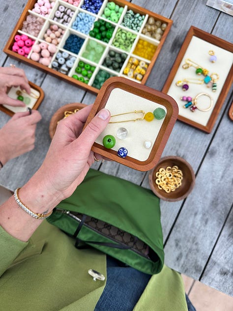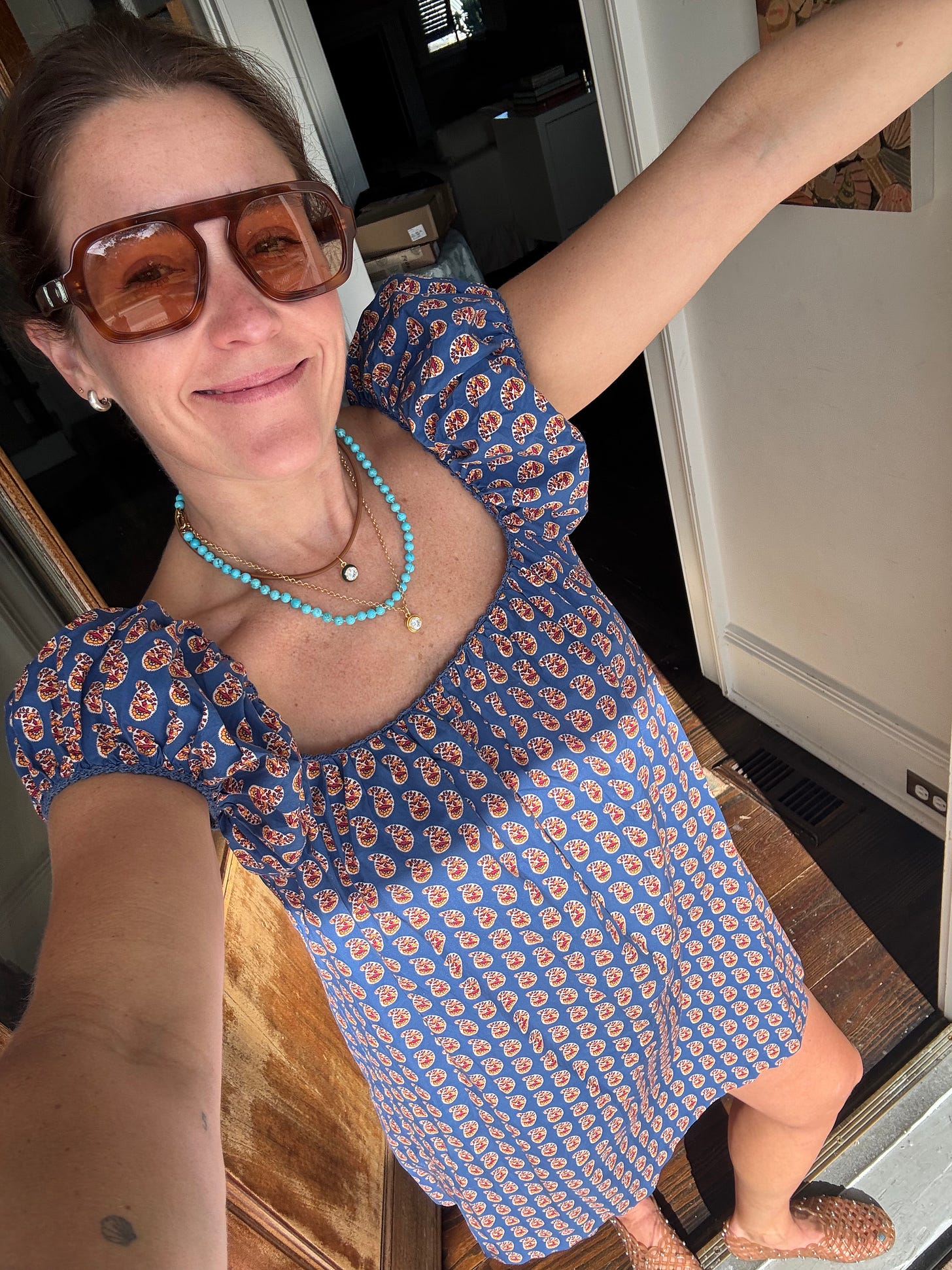 I’m wearing an old Doen dress (similar here), Steve Madden jellies, Elisa Johnson sunglasses, silver hoops, this turquoise necklace, this corded necklace and this bezel drop necklace.